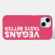 This graphic features bold, pink typography stating “VEGANS TASTE BETTER” prominently. The design employs a modern, eye-catching font that emphasises the positive message about veganism. The bright colour scheme and strong text create an engaging visual, appealing to those who appreciate or promote plant-based lifestyles. This piece can serve as a slogan for a vegan campaign, restaurant, or awareness initiative