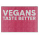 This graphic features bold, pink typography stating “VEGANS TASTE BETTER” prominently. The design employs a modern, eye-catching font that emphasises the positive message about veganism. The bright colour scheme and strong text create an engaging visual, appealing to those who appreciate or promote plant-based lifestyles. This piece can serve as a slogan for a vegan campaign, restaurant, or awareness initiative