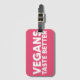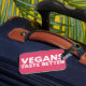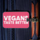 This graphic features bold, pink typography stating “VEGANS TASTE BETTER” prominently. The design employs a modern, eye-catching font that emphasises the positive message about veganism. The bright colour scheme and strong text create an engaging visual, appealing to those who appreciate or promote plant-based lifestyles. This piece can serve as a slogan for a vegan campaign, restaurant, or awareness initiative