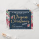This retro Vegan Christmas invitation features white and golden text on an elegant blue background with floral wintry decorations and borders.