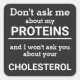 This minimalist fun sticker, featuring the wording "Don't ask me about my proteins and I won't ask you about your cholesterol" in white lettering on a black background, is the perfect gift for every vegan.