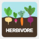 This vegan sticker features an illustration of colourful vegetables (beet, carrot, radish, and turnip) growing up from the ground, with the caption HERBIVORE in white all caps lettering.