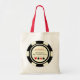 This off-white and black poker chip style tote bag would make a perfect gift for your birthday guests to carry through the night of gambling. Personalize the design with your name and birthdate # in black in the center, and your text in red on top.