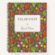 Red Violet spiral notebook with ivory title panel reading ‘Salad Days & Good Cheer,’ bordered in plum, with watercolor tomatoes, onions, carrots, lettuce and herbs
