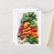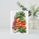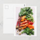 This postcard features a photo of vegetables, including carrots, beets, radishes, and garlic.