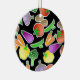 Illustration of lots of colourful vegetables set against a black background. Vegetables include yellow peppers, carrots, broccoli, mushrooms, garlic, aubergine, potatoes and tomatoes. Image available on various gifts and products.