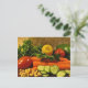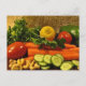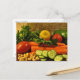 This postcard features a delectable wooden platter of fresh raw vegetables including carrots, tomatoes, peppers, cucumbers and parsley. A lemon and cashews complete the selection. This still life, set on a burlap background, is a beautiful and healthy gourmet meal as well as a colourful artistic composition of red, orange, yellow, green, tan and brown.
