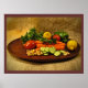 This poster features a delectable wooden platter of fresh raw vegetables including carrots, tomatoes, peppers, cucumbers and parsley. Lemons and cashews complete the selection. This still life is a beautiful and healthy gourmet meal as well as a colourful artistic composition of red, orange, yellow, green, tan and brown.