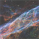 In the Veil Nebula, the ghosts of a colossal stellar explosion linger. Threads of glowing red hydrogen weave through the nebula, energised by the fading shockwave. Pockets of blue oxygen gas and wisps of green nitrogen gas add an eerie beauty to the celestial tapestry. This hauntingly colourful image captures the Veil Nebula's transformation from a massive star to the raw materials for future star systems. - This file is in the public domain in the United States because it was solely created by NASA.