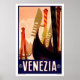 the reproduction of a vintage travel poster for Venice, Italy depicting one of the city's iconic canals and gondolas.