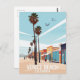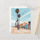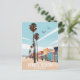 Bright, stylized illustration of the Venice Beach boardwalk, featuring tall palm trees, colorful storefronts, and people walking by the beach.