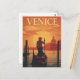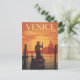 A romantic vintage-style travel poster capturing a tranquil moment in Venice, Italy. The illustration shows a gondolier steering his boat on the Grand Canal at sunset. The classic Venetian skyline, including the iconic dome of Santa Maria della Salute, is silhouetted against a warm, orange sky and the glowing sun. This retro design is perfect for those who love romantic destinations, Italian culture, and classic travel art. It evokes a sense of timeless elegance and makes a beautiful decor piece.