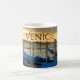 Pretty Venice Italy sunset photography with blue gondolas in the foreground. Golden sky reflection in the water.