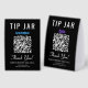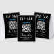 Make cashless tipping easy and stylish with this Tip Jar Sign featuring your Venmo QR code on one side and your Zelle QR code on the other side, perfect for bartenders, salon stylists, baristas, DJs, nail techs, and service pros on the go. Designed with a sleek black background and bold white lettering, this custom QR code paper table sign helps customers quickly scan, send, and show appreciation — no cash required! Display it at your bar, salon station, or event table to encourage instant digital tips while keeping your workspace looking clean and professional. Upload your Venmo and Zelle QR codes and personalize with your business name, phone number, or website for a branded touch. Whether you’re mixing drinks, styling hair, providing personal services, or running a pop-up booth, this modern tip sign makes it easy for clients to say thank you and boosts your earnings with every scan.