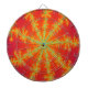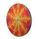 This awesome dart board features a fractal image that is reminiscent of a thunderstorm on Venus. It has a bright orange background with bright yellow lines coming out from the centre that look like burning bolts of lightning. In the centre of each lightning bolt there is a blue line that reminded me of a vein resulting in the title Venous Thunderstorm.