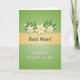 This card features a soft green gradient background that fades lighter toward the top, setting a calm, garden-like scene. Near the upper area, a cluster of white five-petaled flowers with warm golden centers nestles among long, deep green leaves, as if arranged with gentle care ❤️. A faint shadow under the floral group and across the middle gives the artwork a layered, cut-paper look that feels tender and close. Across the center runs a pale orange horizontal band, like a ribbon laid neatly over the green. Centered on that band, the words “Best Mom!” appear in dark green lettering, standing out clearly against the warm strip. Just below, on the green background, the line “Award For Daughter-in-law” is set in small white sans-serif text with a slight shadow, hinting at a sweet family bond 🌼. The palette stays springlike with fresh greens, sunny golds, crisp whites, and that soft orange band stretching straight from left edge to right edge.
