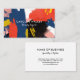 Elegant and stylish business card with trendy fonts against splashes and hasty brushstrokes of watercolor in navy blue, blush pink, vermillion, black, and white.