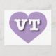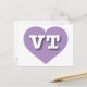 This postcard features a lavender heart containing the bold, white, upper case letters VT, the official abbreviation for Vermont, the green mountain state. The reverse side of the postcard is blank, awaiting your handwritten sentiments or personalised text.