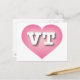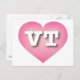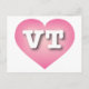 This postcard features a pink heart with a white-washed centre containing the bold, white, upper case letters VT, the official abbreviation for Vermont, the green mountain state. The reverse side of the postcard is blank, awaiting your handwritten sentiments or customised text.