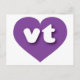 This postcard features a purple heart containing the bold, white, rounded lower case letters vt, a playful abbreviation for Vermont, the green mountain state. The reverse side of the postcard is blank, awaiting your personalised text or handwritten sentiments.