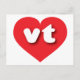 This postcard features a vibrant red heart containing the bold, white, rounded lower case letters vt, a playful abbreviation for Vermont, the green mountain state. The reverse side of the postcard is blank, awaiting your handwritten sentiments or customised text.