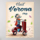 Verona Italy holiday poster. Cartoon man on a little Italian scooter.