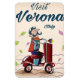Verona Italy holiday poster. Cartoon man on a little Italian scooter.