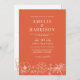 This Verona Sunset Floral All-In-One Elegant Orange Wedding Invitation showcases delicate line art flowers on a bright orange background, complemented by contemporary typography and script calligraphy. This invitation includes the wedding details on the back for those who wish to forego the separate cards for RSVP, hotel, and other info. It is fully customisable with the couple's names and wedding details. The formal design and wording will add a touch of elegance to your wedding celebration.