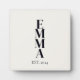 Vertical layout featuring bold serif letters in black stacked over an ivory background. The name vertically runs down the centre with a small phrase "est. 2024" beneath, creating a clean, modern text-focused desk accent.