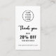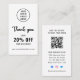 A vertical minimalist custom business logo black and white QR code discount card for a professional business to use as a promotional tool to develop customer loyalty. Replace the image with a square photo of your logo. You can change the font, font colour, font size, letter spacing, background colour, colour of the Thank you graphic and reposition the text using the Design Tool. You can also change the social media icons so they are relevant to your business. The simple modern elegant design is yours to customise as you wish.