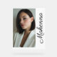 The Vertical Moment with Name acrylic sign features a full portrait image paired with a vertical script name along one side. With a clean white background and black text, this modern design brings a sleek editorial look inspired by magazine layouts.