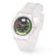I only have one complaint. I ordered the watch with clear case and strap, and what was sent was white case and strap. I'm going to keep it because 1) it looks very nice in white, and 2) it would take too long to get a replacement made and sent in time for my occasion. Aside from the mix up with the color, the watch does look very good in white. The purple dial is actually sparkly which did not show in the online images. That was a nice surprise. If you like Swatch watches this is very similar to those. It's 33.6mm in diameter, 10.5mm thick, and 40.6mm lug to lug. Stainless steel case back says 3ATM/30m WR, so no swimming or showering or submerging this one. If you like Woodstock, this is a great choice.