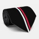 A simple yet bold necktie featuring thin white and red vertical stripes on black. A perfect tie for an interview, graduation, wedding or even a party...a perfect tie for any occasion.