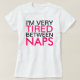 I'm very tired between naps. In large all caps black and pink fonts/letters. Funny for mothers, parenting, aging seniors or anyone who feels just so tired all the time.