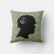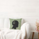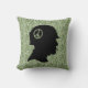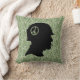 Stylish throw pillow with camo background and Vietnam era soldier silhouette graphic that includes peace sign on helmet.