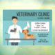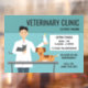 Veterinary clinic open times design featuring Destei's cartoon illustration of a veterinarian man with cute animals. The man is wearing a white laboratory coat while holding a grey cat and a cockatiel type parrot bird. There is also a cute little brown dog lying on a table. Personalise the sample text areas with the details of your business. The background colour is blue.
