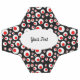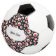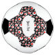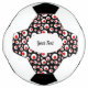 This soccer ball has a vibrant abstract pattern of bright red balls inside larger white balls on a black background. Customise your text in the white oval with the template.