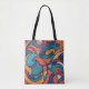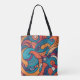 Vibrant abstract pattern with swirling shapes and organic forms in shades of orange, blue, and teal tote bag