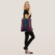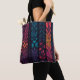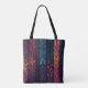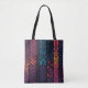 Vibrant and intricate floral pattern with overlapping leaves and petals in shades of purple, blue, orange, and red against a dark background tote bag