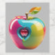 This image showcases a vividly coloured, digitally rendered apple that combines an array of bright, contrasting hues. The apple features a glossy finish with a smooth, reflective surface. In the centre of the apple is a carved heart-shaped cutout containing a smaller apple symbol, emphasising a playful, layered design. The apple's stem is topped with an artistic combination of an orange and green leaf, adding an extra splash of colour and creativity.