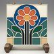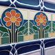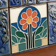 Add a touch of timeless artistic flair to your home with this stunning ceramic tile, inspired by the elegant Art Nouveau movement. The design showcases a beautifully stylised daisy, bursting with colour. Its vibrant orange-red petals radiate from a cheerful sunny yellow centre, creating a warm and inviting focal point. The flower is artfully framed by a bold royal blue arch and flanked by lush, deep green leaves. The composition rests on a geometric base of muted beige and teal, grounding the organic forms above. Each coloured section is outlined with clean, creamy-white raised lines, giving the tile a delightful tactile quality and a look reminiscent of classic stained glass. This versatile tile is perfect for creating a memorable accent in a kitchen backsplash, bathroom, or as a unique decorative piece.