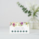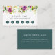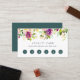 Elegant watercolor floral loyalty cards feature a top border of violet purple flowers and jasper green leaves, with your custom heading, loyalty offer terms, and six punchouts. Shown with "enjoy 20% off after five visits". Personalise the reverse side with your business contact information in white on jewel tone jasper green.