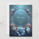 Transport your guests to a moonlit garden with this breathtakingly ethereal botanical arrangement. At the base sits a large, vibrant blue protea style bloom, its petals rendered with a luminous, velvety texture. It is encircled by a lush, symmetrical wreath of pink thistle sprig motifs, soft lavender bud clusters, and feathery bronze-toned foliage. A glowing circular halo illuminates the deep, moody teal background, which is delicately dotted with shimmering stardust. This wedding invitation is a premier choice for a celestial-themed ceremony, a high-end fantasy celebration, or a modern evening garden event. These motifs ensure your celebration begins with a sense of mysterious, organic wonder that will captivate your guests from the moment they open the envelope.