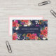 Colourful business card featuring a pattern of hand-drawn flowers in red, pink, orange, and white against a dark blue background. The back is white with navy blue text and a pale pink border. An eye catching floral business cards that suit many different professions.
