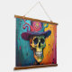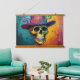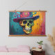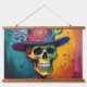 A lively and colorful tapestry featuring an abstract portrait of a skeleton wearing a stylish hat. Dynamic splashes of color and bold strokes create a unique artwork that blends themes of life and death in a striking, artistic form.