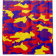 Red, blue, purple and yellow vibrant camouflage print.