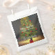 This customisable favour bag instantly captures the cosy holiday spirit with its striking, painterly design. The centerpiece is a classic Christmas tree, rendered in deep green, glowing with golden lights and adorned with vivid red ornaments. This festive scene is set against a dramatic, dark grey background, making the colours intensely vibrant. A small red wrapped gift anchors the base. The bag is fully personalised with a warm "Merry Christmas & Happy New Year" message followed by your family name. It's the perfect elegant packaging for treats and favours, merging timeless holiday cheer with a bespoke touch.
