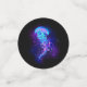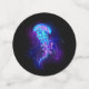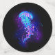 Large, blue, artistically drawn, glowing, bright jellyfish, with long tentacles on black background with purple bioluminescence. Luminous jellyfish.