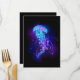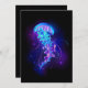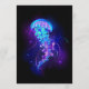 Large, blue, artistically drawn, glowing, bright jellyfish, with long tentacles on black background with purple bioluminescence. Luminous jellyfish.