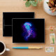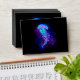Large, blue, artistically drawn, glowing, bright jellyfish, with long tentacles on black background with purple bioluminescence. Luminous jellyfish.